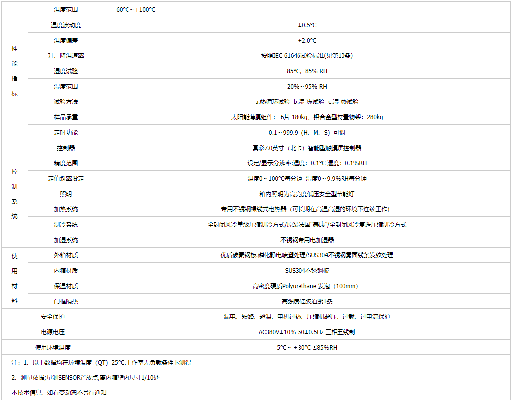 產(chǎn)品簡介:光伏濕凍試驗箱適用于光伏組件(太陽能電池板)做熱循環(huán)、濕凍循環(huán)、高溫高濕雙85試驗,以確認組件能否承受高溫高濕之后隨之的負溫度影響,以及對于溫度重復變化時引起的疲勞和熱失效,另外確定光伏組件曝露在高濕度下而產(chǎn)生的熱應(yīng)力及能夠抵抗?jié)駳忾L期滲透的能力.是光伏組件行業(yè)必不可少的測試設(shè)備。