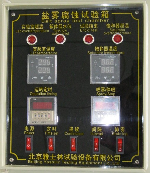 控制面板是鹽霧腐蝕試驗箱的心臟,試驗步驟都是通過控制面板上設定的,為了方便用戶對試驗箱的操作,下面為您講述控制面板功能說明: 實驗室超溫:當鹽霧試驗箱工作室溫度超過試驗設定值一定范圍時,此報警燈亮。 箱體低水位:鹽霧腐蝕試驗箱在試驗過程中缺水時,此報警燈亮。 試驗結束:當試驗運轉時間到達設定值時,此燈亮(設備停止工作)。 飽和器超溫:當飽和器溫度超出空氣開關設定值一定范圍時,此報警燈亮。 實驗室溫度:顯示試驗過程中實驗室的實際溫度和設定溫度。 飽和器溫度:顯示試驗過程中飽和器的實際溫度與設定溫度。 運轉定時:對試驗時間進行實時設定,試驗時間到達設定值,設備停止運轉。 噴霧/停噴:此定時器是噴霧時間設定、停噴時間設定、時間單位選擇。 排霧:試驗結束時,按下此按鈕,將試驗箱內的鹽霧氣體趕出,通過排霧口排出。 間隙:按下此按鈕,噴霧塔將按計時器設定的時間進行間隙性噴霧。 連續(xù):按下些按鈕,噴霧塔進行連續(xù)噴霧。 定時:按下此按鈕才可以對設備進行試驗運轉總時間定時。 電源:設備通電工作。