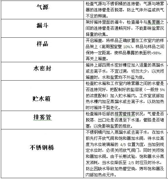 我們都知道,初次使用鹽霧試驗(yàn)箱有很多講究,更是要做好十足的準(zhǔn)備工作。那么,究竟在啟動(dòng)鹽霧試驗(yàn)箱前我們要注意哪些事項(xiàng),如何做好充足的準(zhǔn)備?下表是小編整理的關(guān)于鹽霧試驗(yàn)箱啟動(dòng)前需做的準(zhǔn)備工作,感興趣的朋友不妨一起來看看吧。