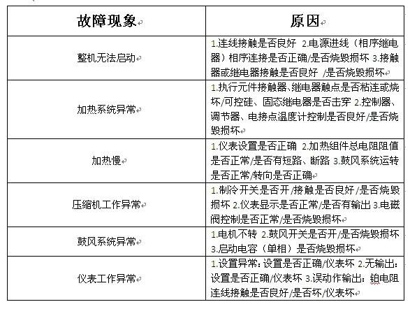 很多人可能會對高低溫試驗(yàn)箱偶爾出現(xiàn)的異常狀況弄的一頭霧水,下面就有請專業(yè)技術(shù)工程師為我們講解高低溫試驗(yàn)箱出現(xiàn)異常狀況時(shí)我們應(yīng)該怎么處理,下面的一張表讓你明明白白,大家可簡單的對號入座。